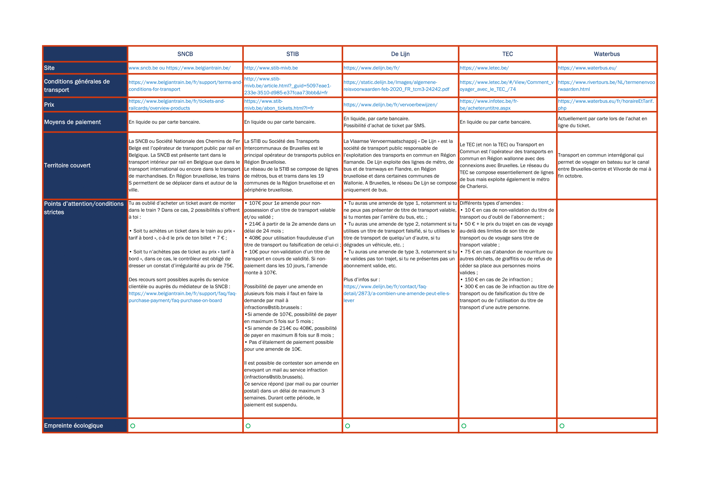 A Bruxelles, le réseau des transports en commun est géré conjointement par la SNCB, la STIB, De Lijn, le TEC et le Waterbus pour le transport fluvial.