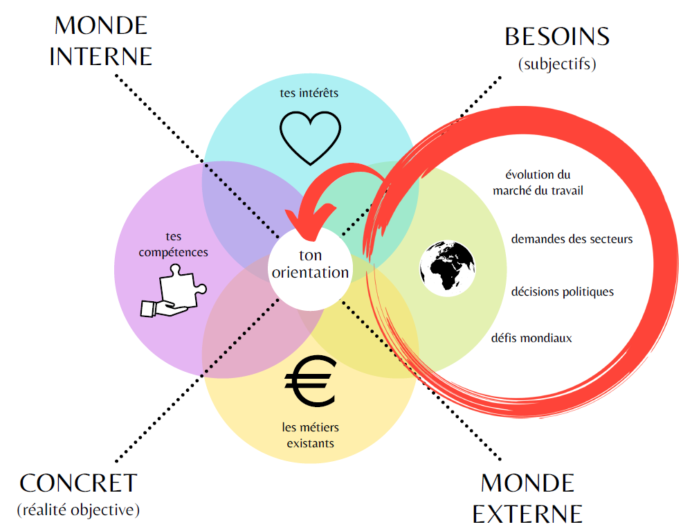 Ces 4 approches sont reprises dans les 4 cercles d’Andres Zuzunaga & Marc Winn (souvent appelés Ikigaï). Ce qui est entouré en rouge correspond aux besoins du monde. Ce sont les défis mondiaux, les décisions politiques, les demandes des secteurs et l’évolution du marché du travail.